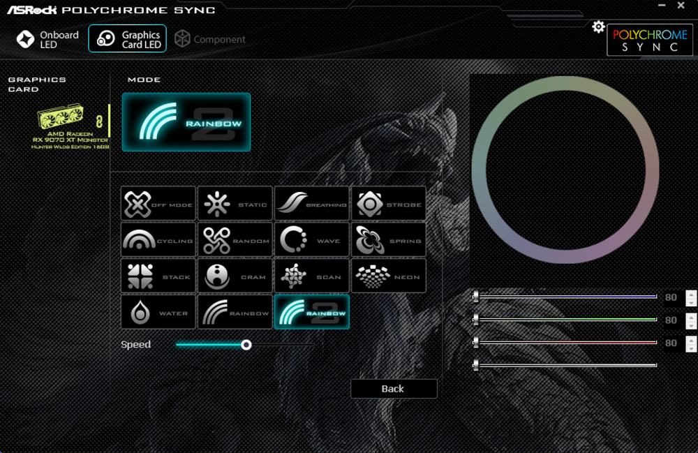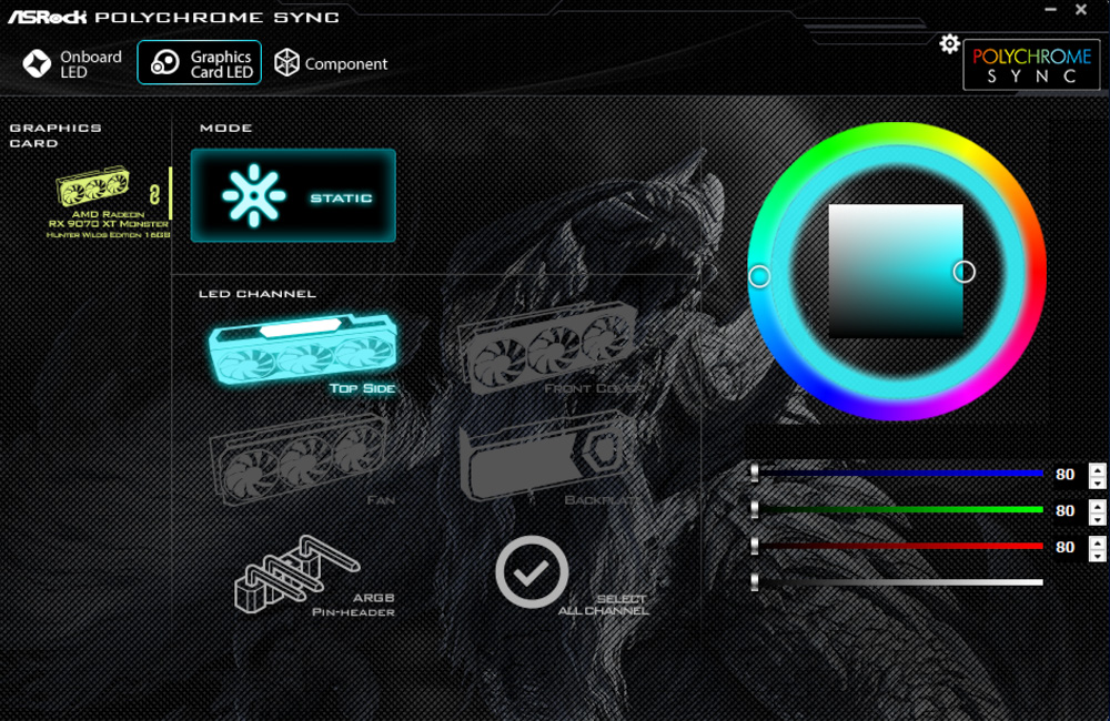 Radeon RX 9070 XT MONSTER HUNTER WILDS EDITION 16GB 顯卡燈效,主要著重於顯卡側面的鎖刃龍 「ARKVELD」Polychrome RGB燈效,作為視覺點綴;並且玩家可透過Polychrome Sync軟體,進一步調整顯卡 RGB 燈效;這裏附上實機燈效圖供各位參考。