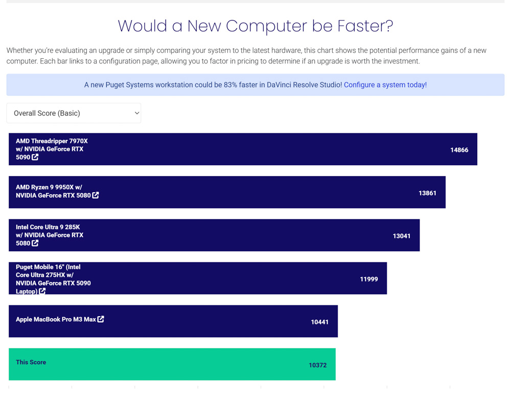 PugetBench for DaVinci Resolve 測試,則針對 4K、8K 的影像測試,包含 4K H.264 150mbps 8-bit、4K ProRes 422、4K RED、8K H.265 100mbps、8K RED 等媒體,並利用 GPU 特效的 OpenFX 與 Fusion 等特效來測試電腦的影音創作性能。