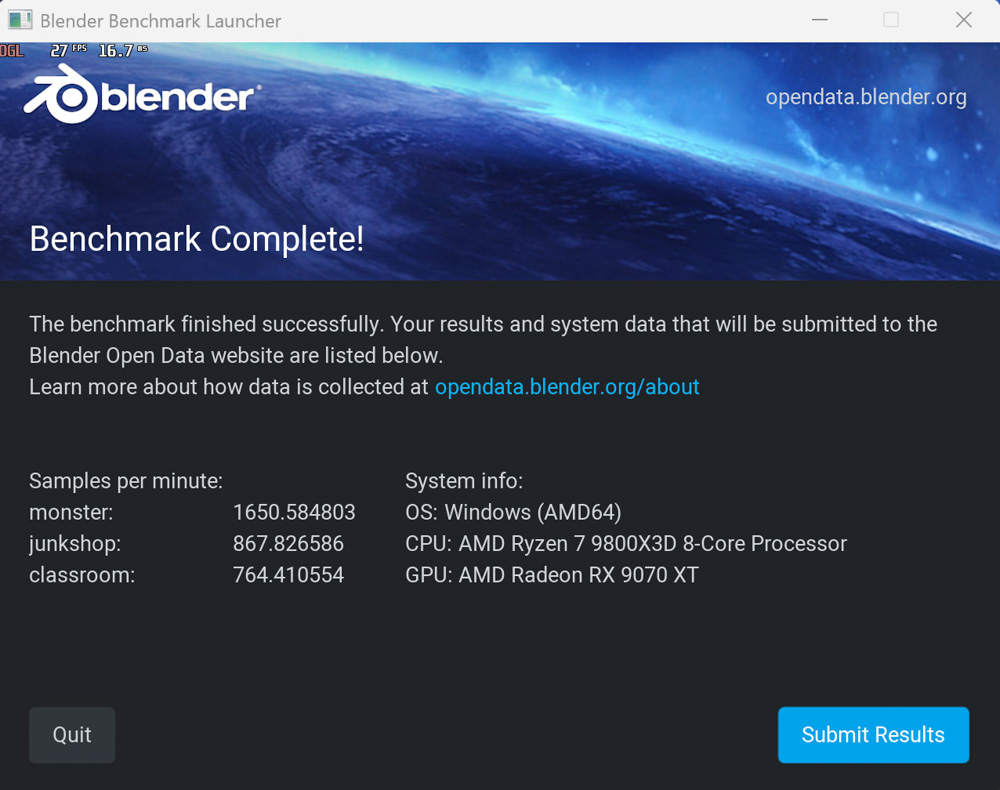 Blender Benchmark 4.5.0 測試,Radeon RX 9070 XT Monster Hunter Wilds Edition 16GB 在 monster 獲得 1650.58 每分鐘 Sample 數量,而 junkshop 867.82、classroom 764.41 成績。