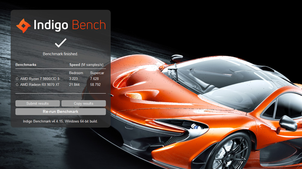 Indigo Bench 為 Indigo 4 渲染引擎的效能測試軟體,採用 OpenCL 架構能夠支援 NVIDIA、AMD 和 Intel 各家顯示卡,以及處理器的渲染效能測試,透過提供Badroom、Supercar等兩個場景渲染來評分,會以每秒渲染完成單位作為成績總結,測試成績越高則代表越好。