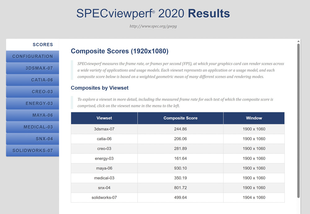 SPECviewperf 2020為 包含各項專業領域的 3D 繪圖與CG渲染軟體的基準測試軟體,測試過程使用 OpenGL 和 DirectX API 運行 3D 圖形效能模擬實測,並依據渲染場景的每秒FPS來評分,本次以 1080P 畫質進行測試,而項目分為 3ds Max、CATIA、Creo、Energy、Maya、medical、snx、SolidWorks 等專業工作軟體。
