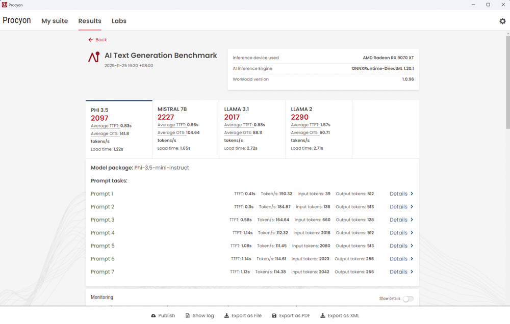 UL Procyon AI Text Generation Benchmark 提供 ONNX 模型包含 Phi-3.5-mini、Llama-3.1-8B、Mistral-7B 與 Llama-2-13B 測試,每個模型測試 7 個 Prompts 包含 RAG 與非 RAG 的查詢,通過權重後的總分與平均 Time To First Token(TTFT)、平均 Output Token Speed(OTS)提供專業用戶橫量電腦的 AI LLM 推論效能。