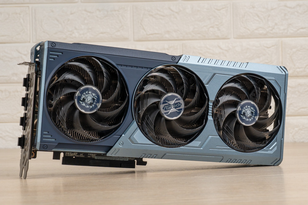 整體有如鎖刃龍的裝甲風格,以象牙銀和青藍色烤漆的金屬外殼,搭配周邊裝甲紋路,作為視覺點綴;並設有 3 顆條紋環形風扇,且軸心位置標有鎖刃龍與ASRock圖示,皆正轉風向,確保風道氣流能直通內部的散熱鰭片;顯卡長度為 29.8cm、高 13.1cm,佔 2.9 Slot 的安裝空間。