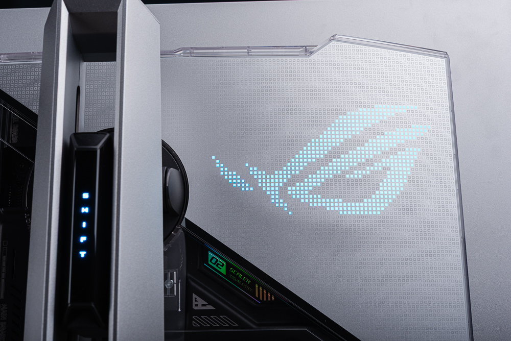 ROG Swift OLED PG27AQWP-W 顛覆過往都是黑色的電競螢幕,採用科技感的銀色外殼、支架與金屬底座,並將螢幕背面的外殼改為半透明造型,內部些微裸露內部電路板的透視設計。而螢幕背面右上角一樣有著點陣 ROG 標誌,左半邊看似有著兩個 RGB 標誌,但其實是具備幻彩反射的銘牌。