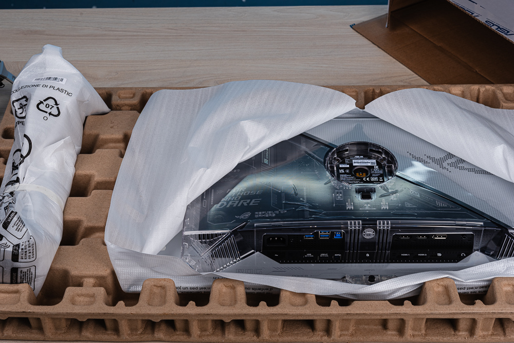 ↑ ROG Swift OLED PG27AQWP-W 彩色外紙箱;出廠時應該是雙層紙箱包裝運送。
