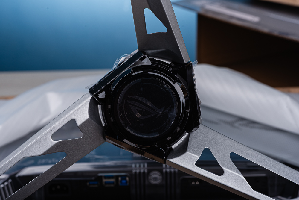 ROG 經典的三角投射燈底座,這次三個金屬腳採用相同的鏤空銷切造型,搭配中央的 ROG 投射底燈。出廠時預設將投射燈指定為藍青色。
