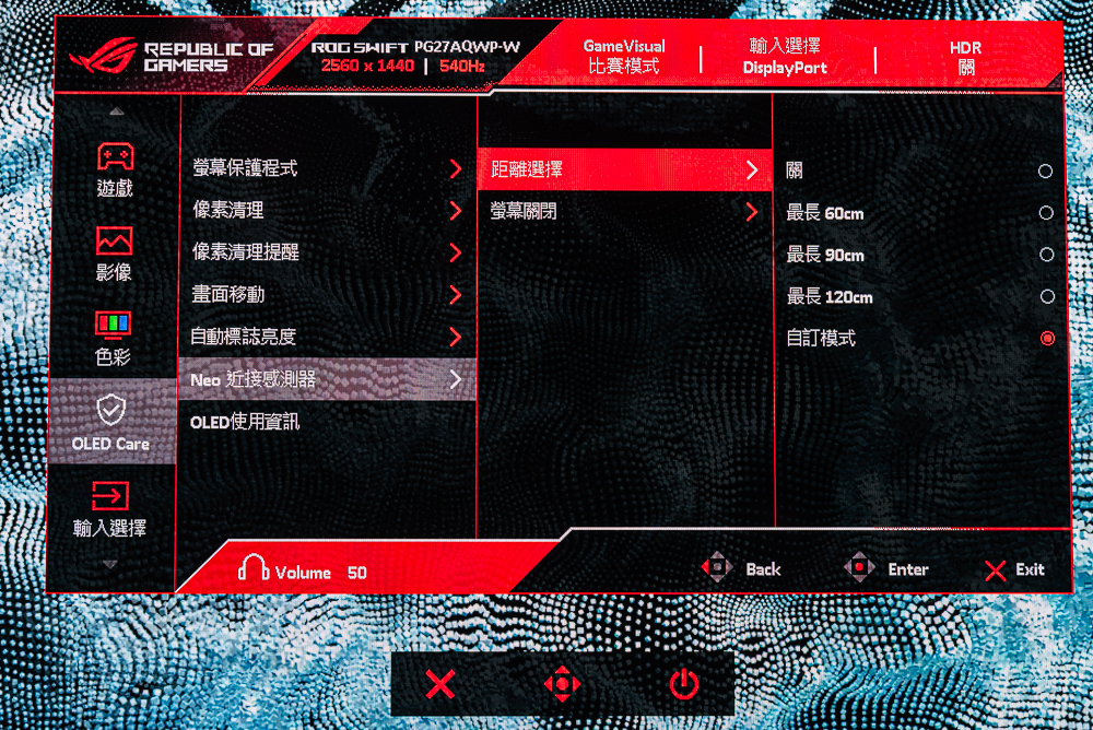 PG27AQWP-W 同樣有著「Neo 近接感測器」,同樣屬於 OLED CARE PRO 的保護功能之一。除了螢幕本身有客制化散熱設計外,也常駐螢幕保護、像素清理、畫面移動、標誌亮度調節等功能。新加入的 Neo 近接感測器,則可設定使用者與螢幕的距離,讓螢幕偵測到前方沒人時最快 5 分鐘能關閉螢幕。