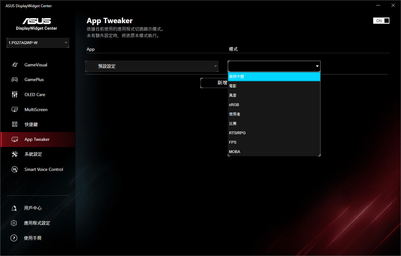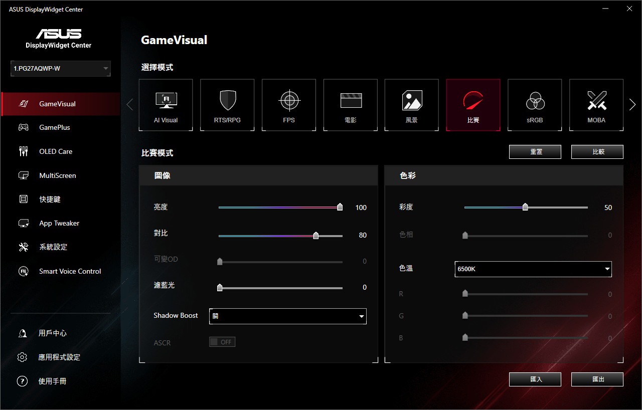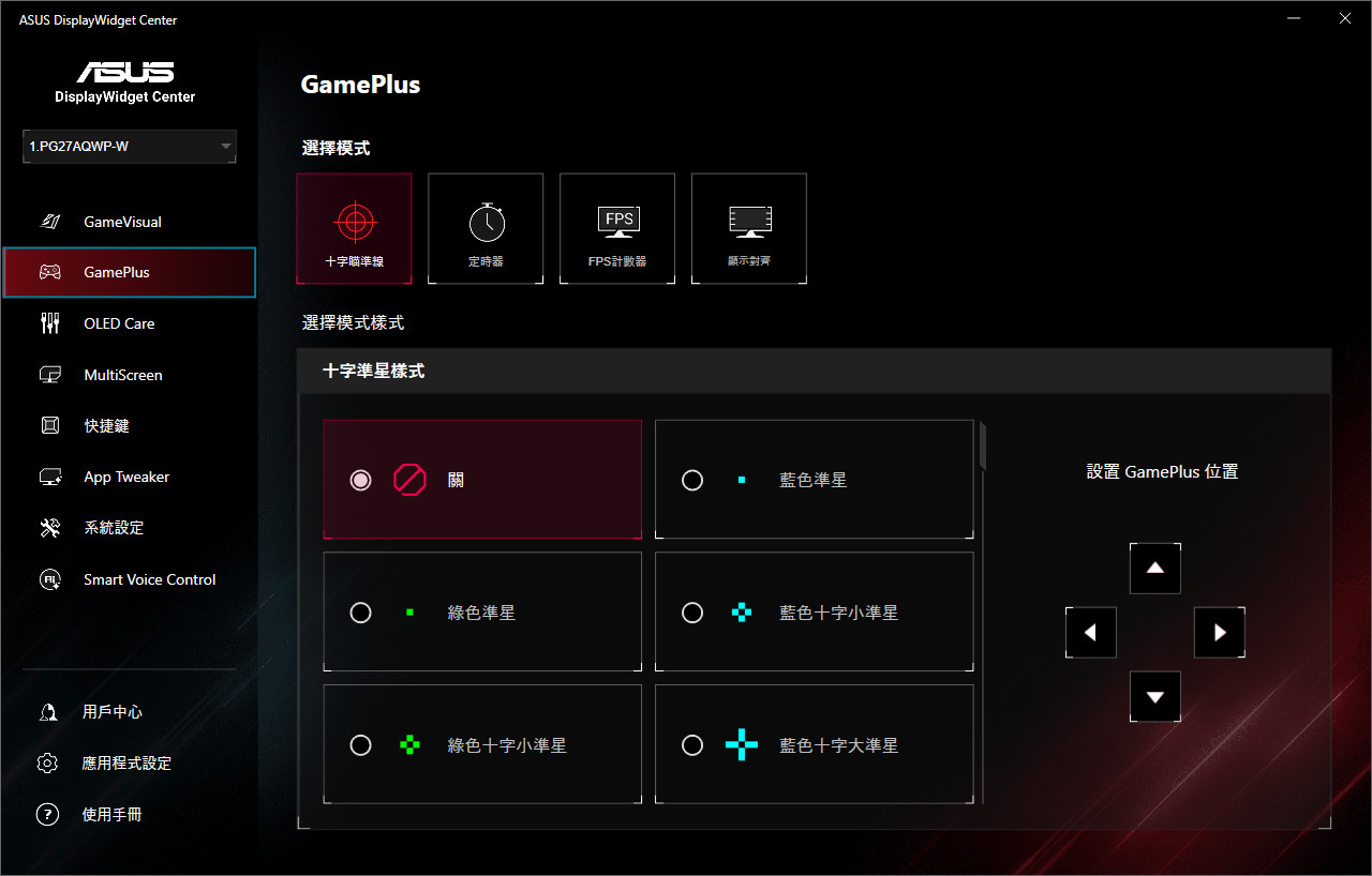 上述的 OSD 功能都可透過 ASUS DisplayWidget Center 小工具來幫忙調整,一樣有著 GameVisual、GamePlus、OLED Care 等所有螢幕 OSD 可調整的功能。