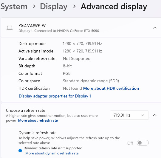 PG27AQWP-W 可點亮 2560 x 1440、8-bit、RGB、SDR、540Hz 的規格。開啟 HDR 後則顯示亮度峰值為 1405 nits。此外,開啟「更新率增益」則可切換為 1280 x 720、8-bit、RGB、SDR、720Hz 的超高更新率的規格。