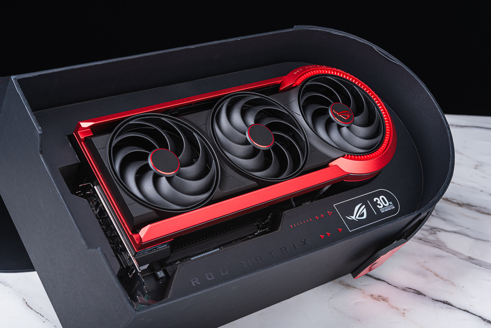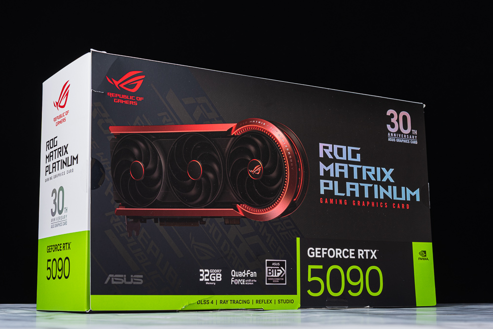 30 週年得來不易,華碩顯示卡如今已跨入而立之年,在這特別的日子對於顯卡廠商來說當然是推出一張能夠承襲經典、淬鍊完美的 30 週年紀念版「ROG Matrix Platinum GeForce RTX 5090」,以現代散熱頂級工藝呼應 ROG 第一張顯卡的散熱造型,利用自家 BTF 背插 GC-HPWR 與 12V-2×6 雙供電解鎖最高 800W GPU 功耗、GPU 時脈超頻至 2760 MHz,挑戰當代最強的風冷散熱卡王。