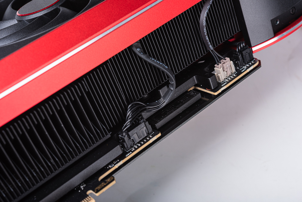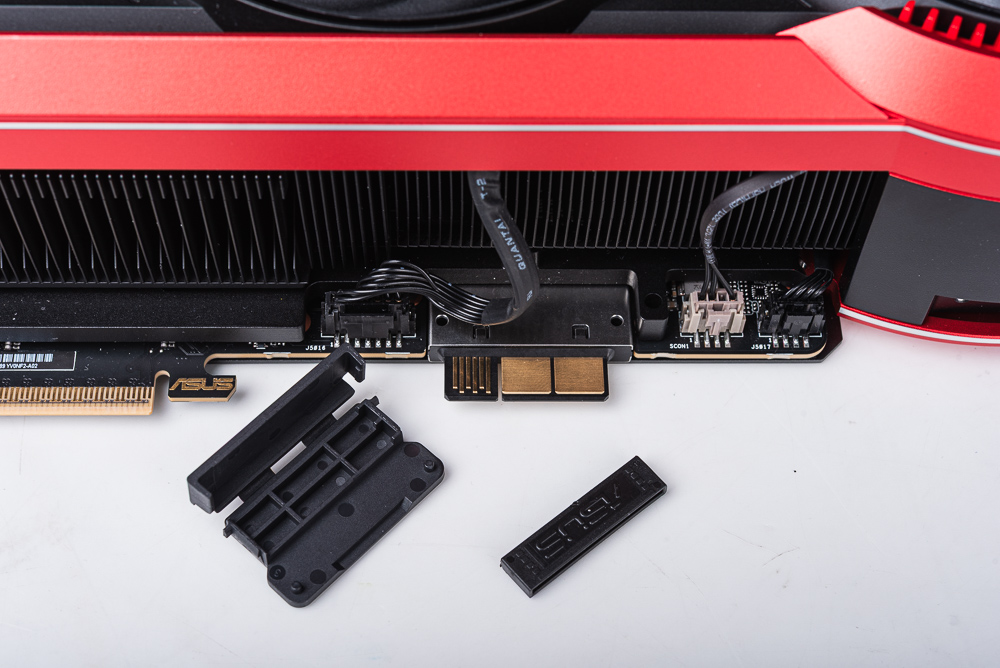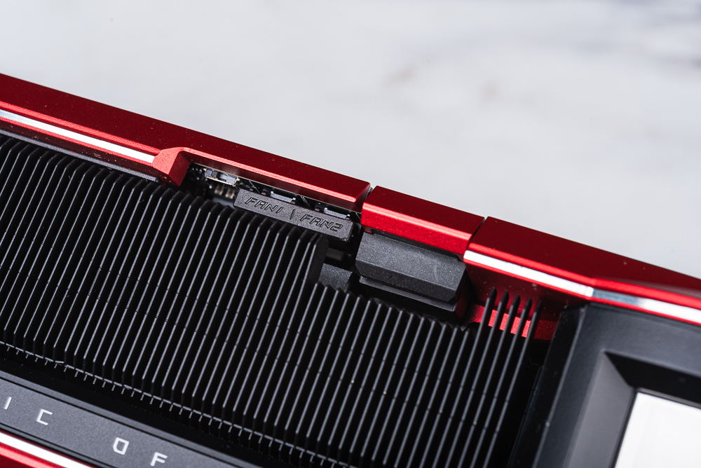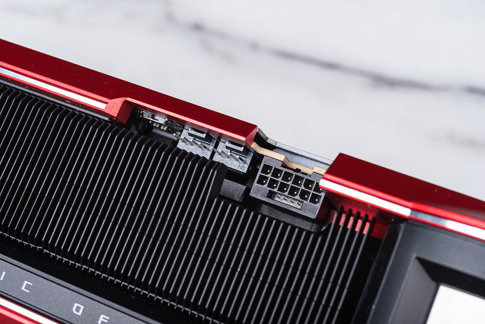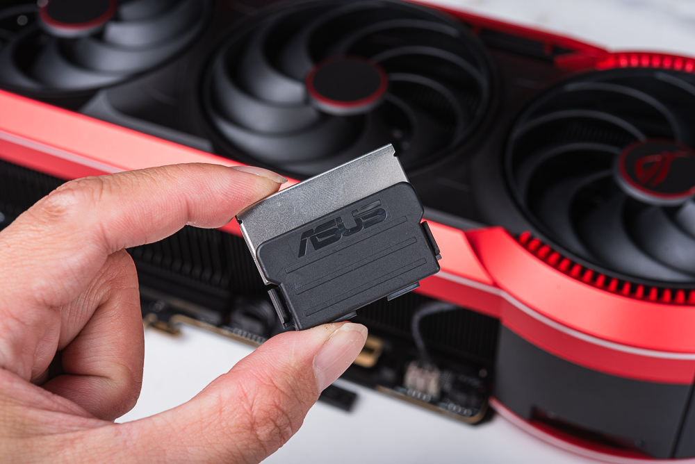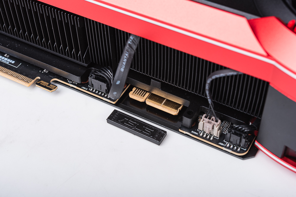 顯卡側面可以見到滿滿的散熱鰭片,以及使用隱藏起來的 PCIe 16pin、12V-2×6 的供電插座,在其旁邊則有 2 個 4pin PWM 風扇擴充與雙 BIOS 的切換開關。ROG 設計一個 12V-2×6 的專屬保護塞。