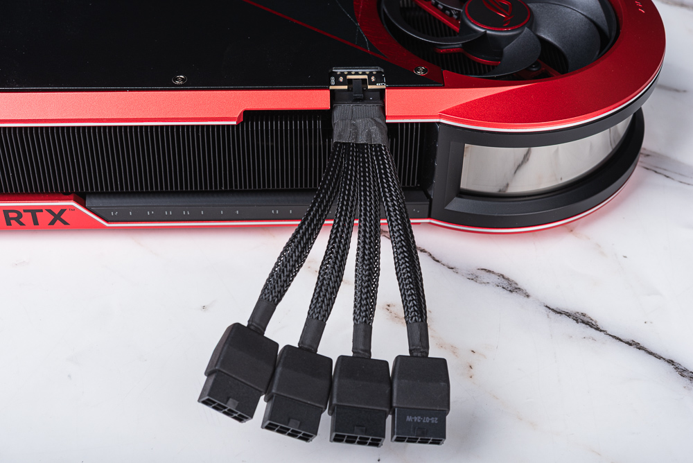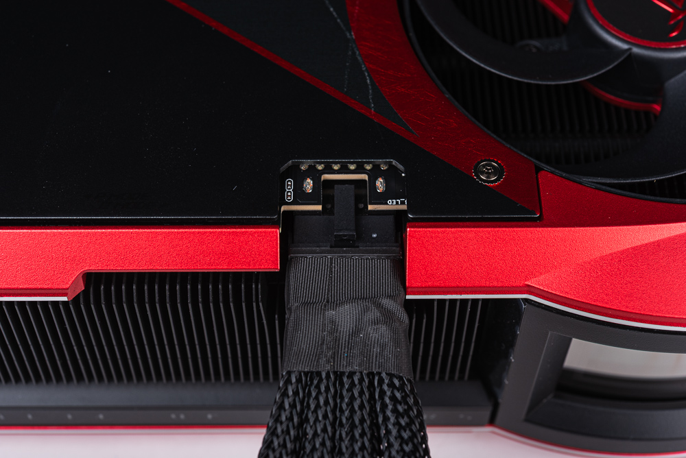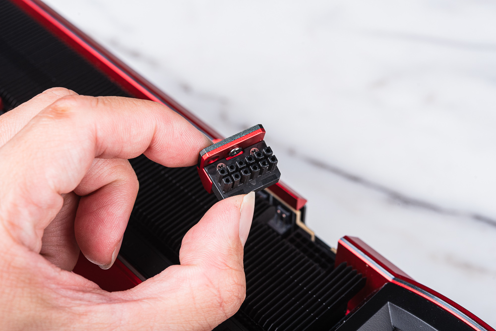 不過這張顯卡使用時要注意,顯卡外殼相對突出的關係,若使用的電供原生 PCIe 16pin 電源連接線,有著較大的連接器接頭設計時會與顯卡外殼發生衝突,因此使用時建議挑選使用標準 PCIe 16pin 外殼的電源供應器。