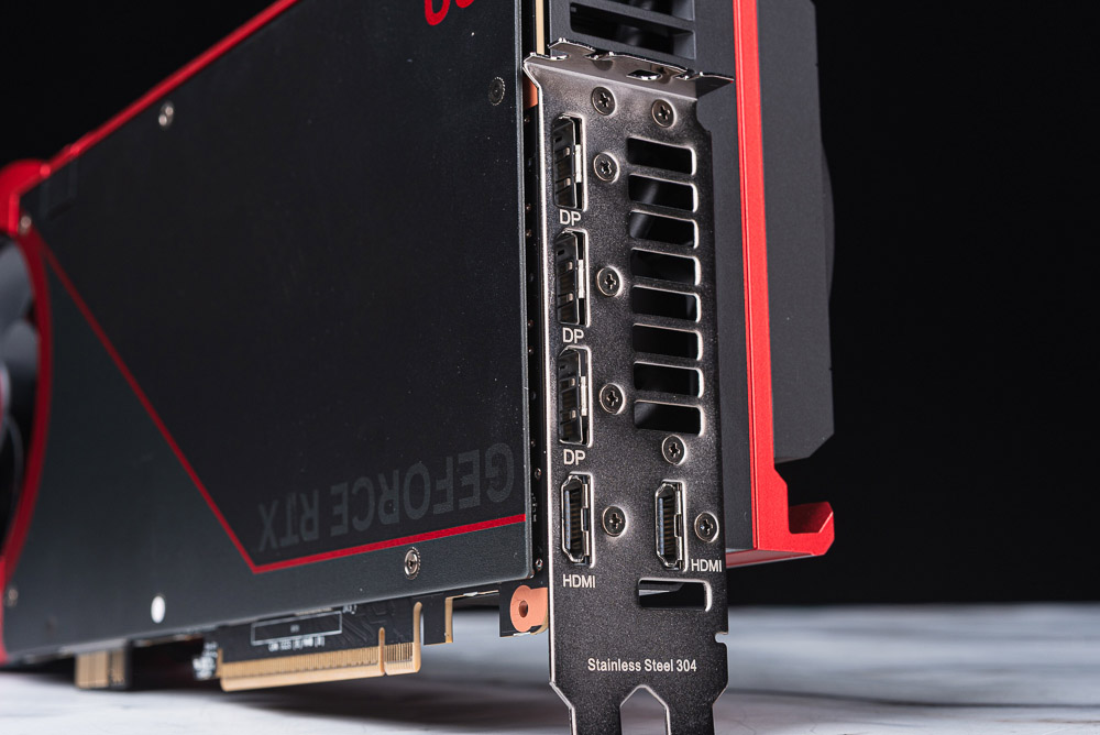 顯示輸出,則提供 3 個 DisplayPort 2.1b 與 2 個 HDMI 2.1b 連接埠,但最多同時 4 螢幕輸出;對於多螢幕使用上,有著較多的 HDMI 確實會讓玩家在搭配螢幕使用上更有彈性。而顯卡後方 PCIe 檔板一樣採用 304 不鏽鋼材質打造,能有更好的抗氧化能力。