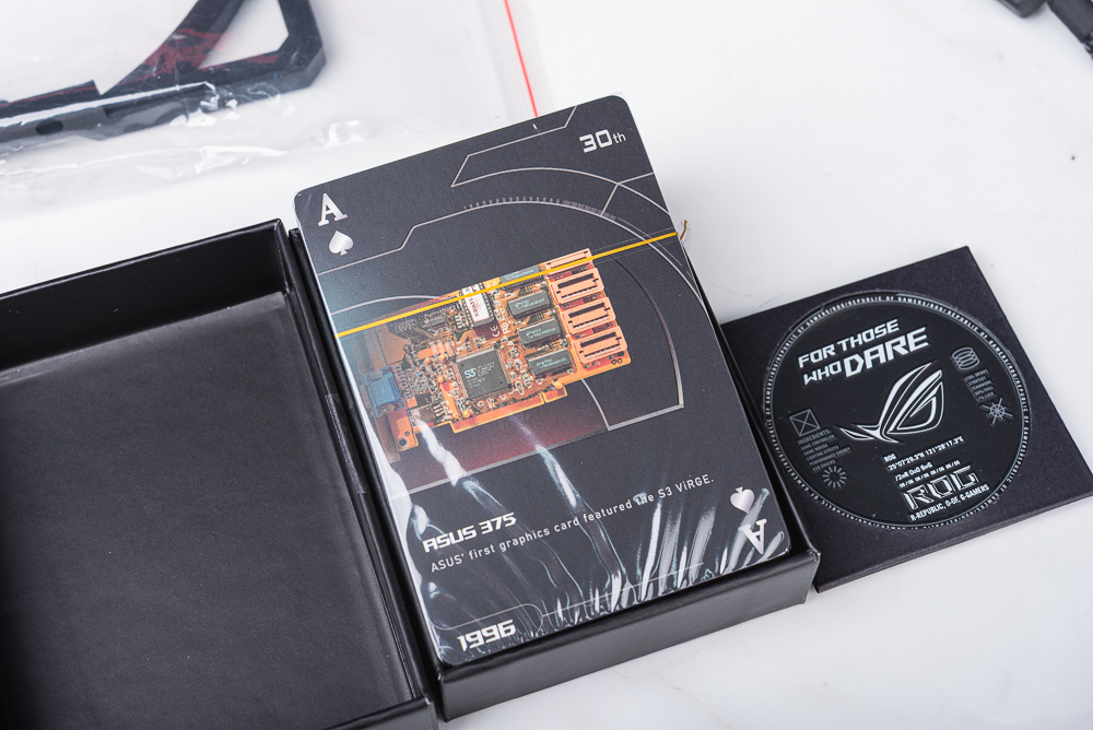 配件:顯卡支撐架(兼螺絲起子)、魔鬼氈、磁鐵、華碩顯卡 30 週年紀念撲克牌