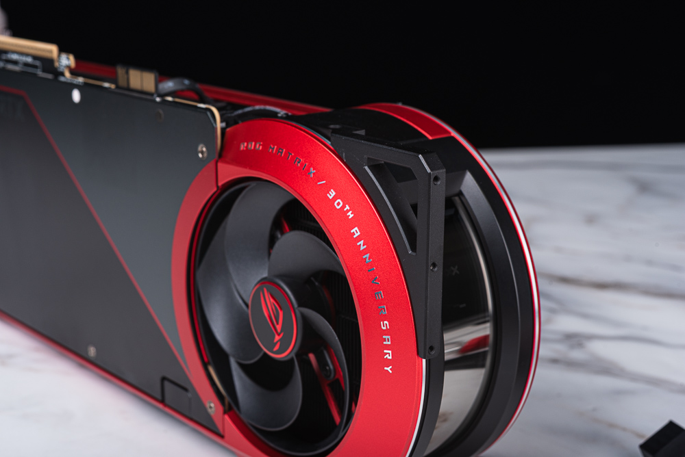 顯卡前方圓形處則有著 ROG MATRIX / 30th ANNIVERSARY 紀念版字樣,仔細看顯卡造型有著相當豐富的細節,以及不同結構、線條堆疊出的立體造型感;尤其顯卡前方的曲面 MATRIX 字樣,搭配 ARUA 燈效後,反而讓人有種宇宙飛船的未來科技感。