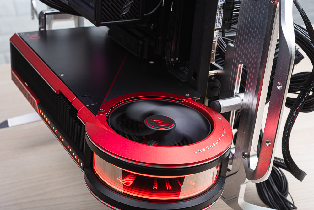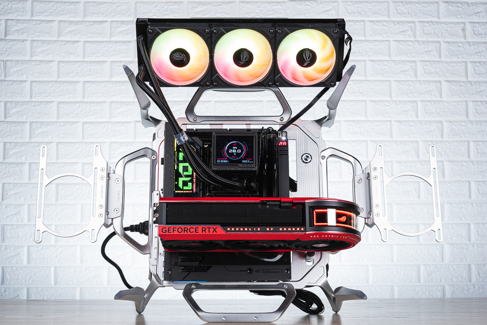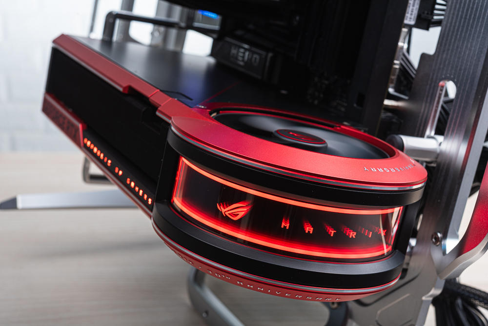 ROG Matrix Platinum GeForce RTX 5090 預設採用紅色燈效,顯卡側面的 REPUBILC OF GAMERS,以及前方圓形的 MATRIX 無限鏡都具備 AURA 燈效。此次測試搭配使用 ROG MAXIMUS Z890 HERO BTF 主機板、ROG Ryujin III 360 散熱器與 ROG Thor III 1600W 電源供應器,測試用的開放式機殼則是 InWin Shift。