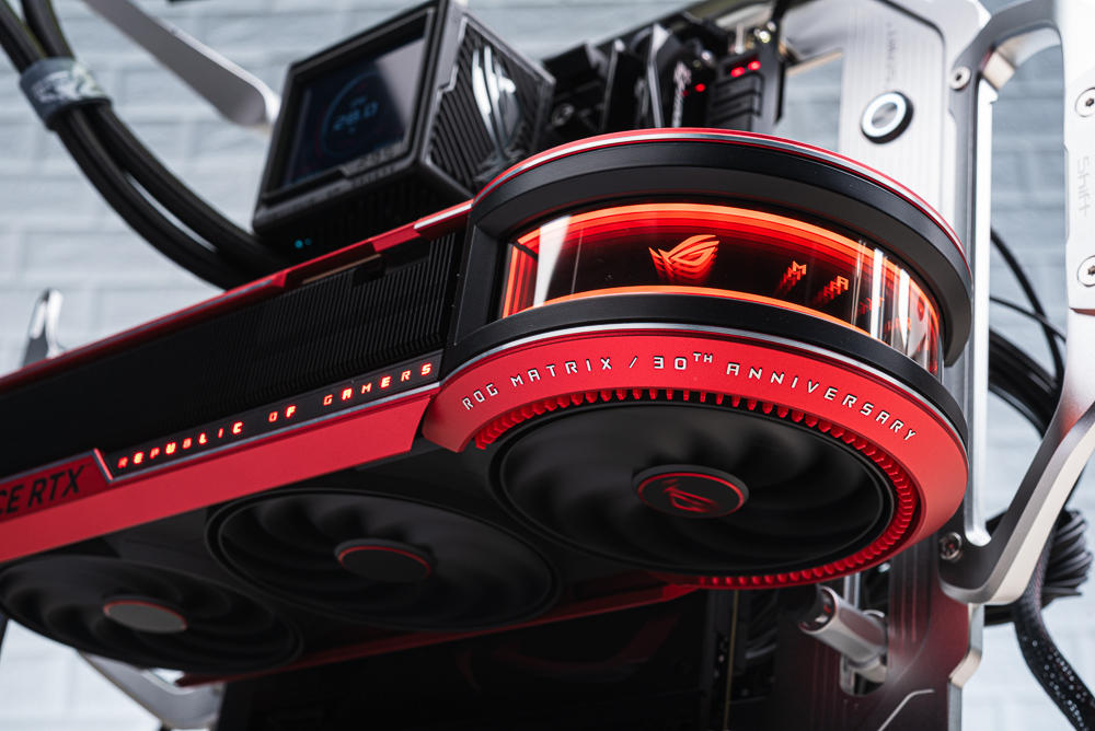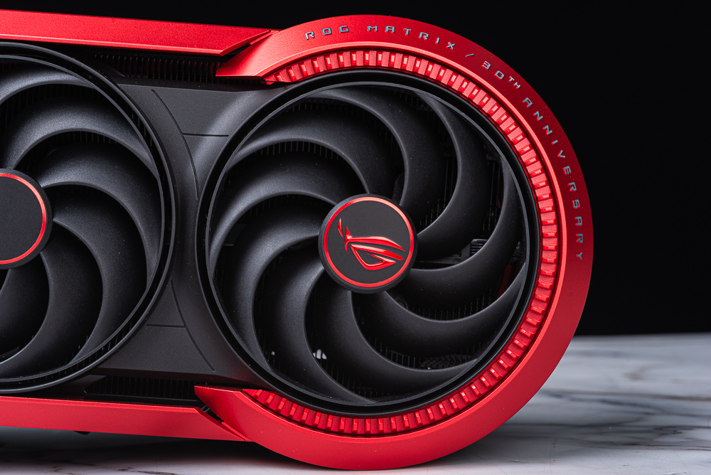 ROG Matrix Platinum 採用與 ROG Astral 相同的 4 風扇設計,在顯卡正面有著 3 顆正逆轉配置的軸向式風扇負責吸入冷空氣;另一顆風扇則在背面,作為穿透氣流設計的排風風扇,借住 4 風扇帶動氣流穿過厚重的散熱鰭片。