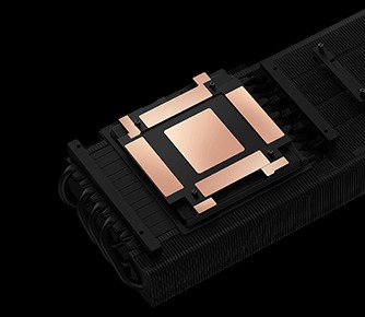 顯卡散熱器與 GPU 之間採用「液態金屬」做為散熱介質,能帶來更好的熱傳遞能力;緊接著使用均溫熱導板複合導熱管與散熱鰭片,藉助均溫板快速替 GPU 與記憶體散熱,隨後利用多根熱導管引導至整組散熱鰭片,最後通過 4 風扇氣流壓制溫度,達到出色的溫度壓制能力。