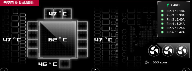 感熱圖會分別呈現 GPU 與記憶體的溫度,以及兩側的 VRM 供電模組溫度的監控功能;右上角將滑鼠游標移到 12V-2×6 接頭時,則會顯示出 6 根 +12V 供電針腳目前負擔的電流值:下方有著顯卡風扇轉速資訊。