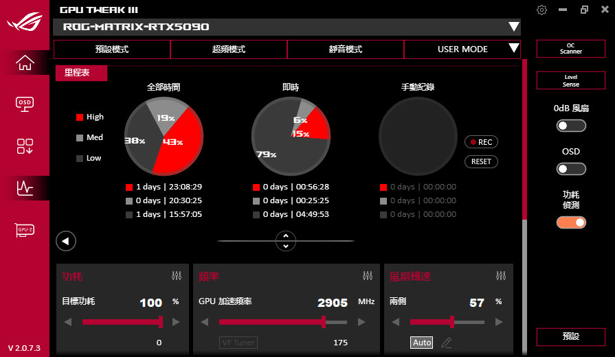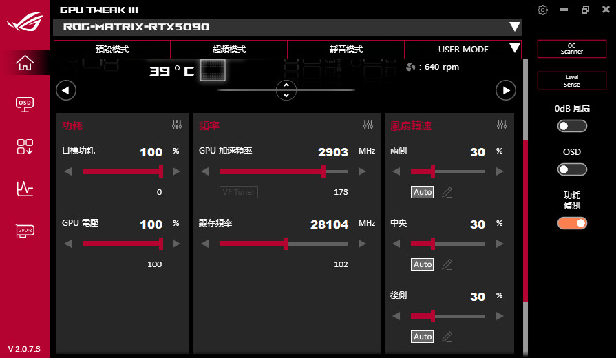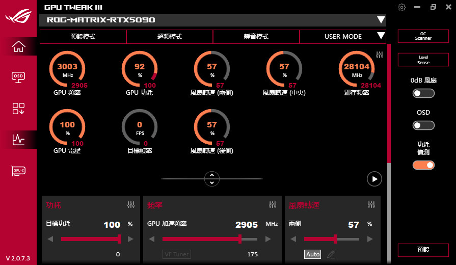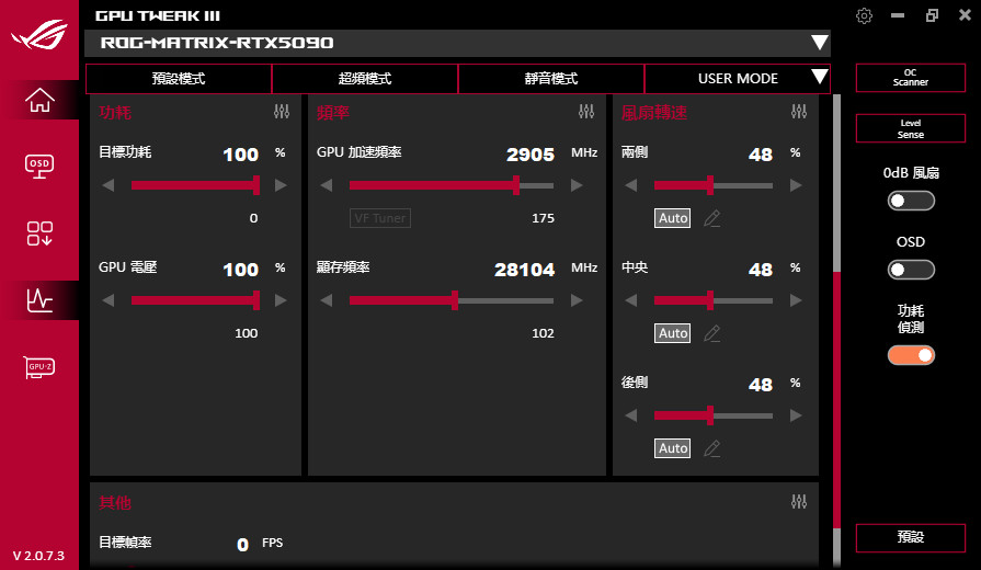 而在軟體上方有提供:預設、超頻、靜音與 USER 自訂等模式,ROG Matrix Platinum GeForce RTX 5090 開啟「超頻模式」會在增加 60MHz 時脈,達到 Boost OC 2760 MHz 的超頻時脈。當然玩家可自訂目標功耗、GPU 電壓、GPU Boost 時脈、記憶體頻率,以及兩側風扇、中央風扇與後側風扇的轉速控制。