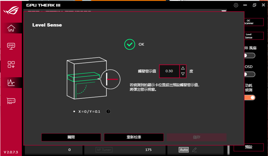 GPU Tweak III 軟體首頁的右手邊有著「Level Sense」的水平感測功能,開啟後需要先「重新校準」目前顯卡的水平度,接著需要指定「觸發警示值」0.3 度,意思是當顯卡偵測超過 0.3 度傾斜時會由軟體發出警告通知。