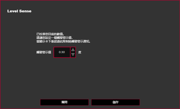 這功能在呈現上有點沒這麼直覺,因為無法顯示目前顯卡的水平度;至於觸發警示值建議設定在 0.3-1 度之間,若設定數值太低則會太敏感,可能稍微用力拍桌子都有可能觸發。