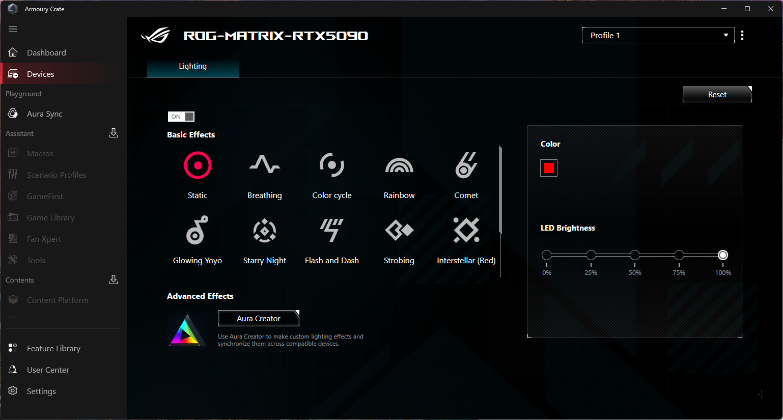 燈效方面則要使用 Armoury Crate 軟體,在 Devices 頁面中可控制 ROG Matrix Platinum GeForce RTX 5090 顯卡的燈效,包含顯卡前方圓形的 MATRIX 無限鏡,以及顯卡側面的 REPUBILC OF GAMERS 字樣,都具備 AURA 燈光效果。不過實際改變後,還是發現靜態紅色燈效最適合 ROG Matrix Platinum。