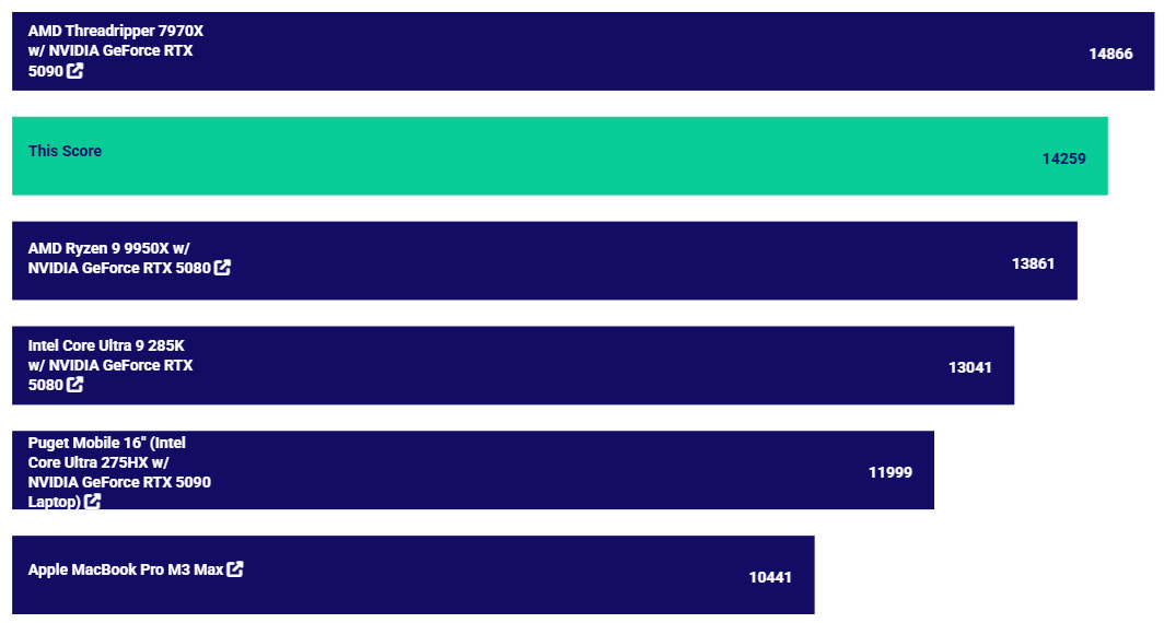 標準測試 ROG Matrix Platinum RTX 5090 獲得基準 14259 分、標準 14825 分的成績。這效能屬於 PugetBench 的前段班,相比最高分數的 RTX 5090 差異則在於 CPU 不同。