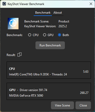 KeyShot 是由 Luxion 所開發的 3D 渲染軟體,能夠快速的建立逼真的 3D 模型影像,並以直覺的介面與即時渲染而出名。KeyShot 預設使用 CPU 進行渲染並支援 GPU 加速渲染等功能,在 KeyShot Viewer 當中提供 Benchmark 功能。KeyShot Benchmark 基準分為 1,測試分數越高代表性能越好。