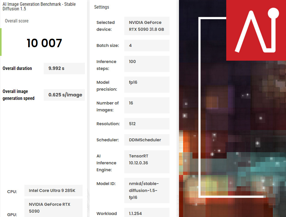 ROG Matrix Platinum RTX 5090 目前在主流的 Stable Diffusion (FP16)、TensorRT 測試中,獲得 10007 分的成績、總耗時 9.9s 秒、生成一張圖片需要 0.625s 秒的時間。至於 Stable Diffusion XL (FP16) 模型,則是 8238 分成績、總耗時 72.8s 秒、生成一張圖片需要 4.5s 秒的時間。