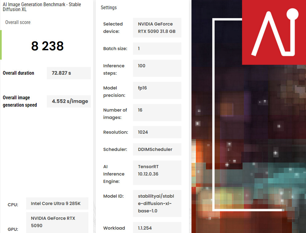 UL Procyon AI Image Generation Benchmark 提供 Stable Diffusion XL (FP16) 與 Stable Diffusion 1.5 (FP16) 的兩種測試情境,並支援 ONNX runtime with DirectML、NVIDIA TensorRT 與 Intel OpenVINO 的推論引擎。
