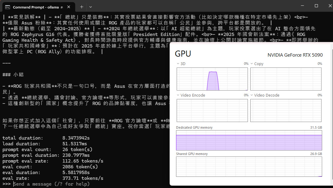 通過 Ollama 應用程式來部署 nemotron-3-nano:30b 模型。模型執行時需要佔用約 24.2 GB 的 GPU 記憶體。測試使用 Prompt:說明 ROG 玩家共和國。最終模型通過思考與推理後最終給出答案,花費 8.3 秒完成推論與輸出,推論效能約每秒 373.1 tokens/s。
