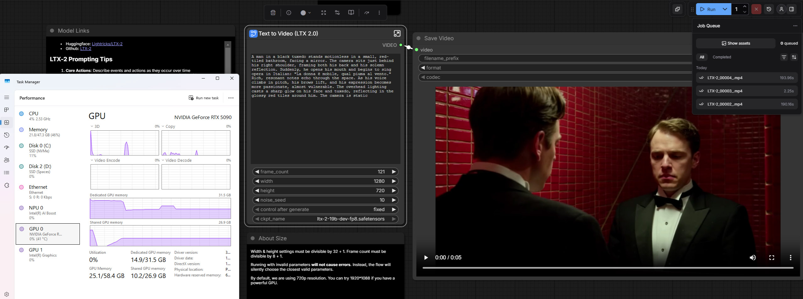 使用 ROG Matrix Platinum RTX 5090 執行,約需要 190 秒左右的時間才能完成 AI 影片生成。實際測試 FP8 精度佔用相當大量的 VRAM、系統記憶體與 SSD,若要有更好的效能需要使用 ltx-2-19b-dev-fp4 的 Checkpoint 版本,即可大幅提升速度並降低硬體需求。