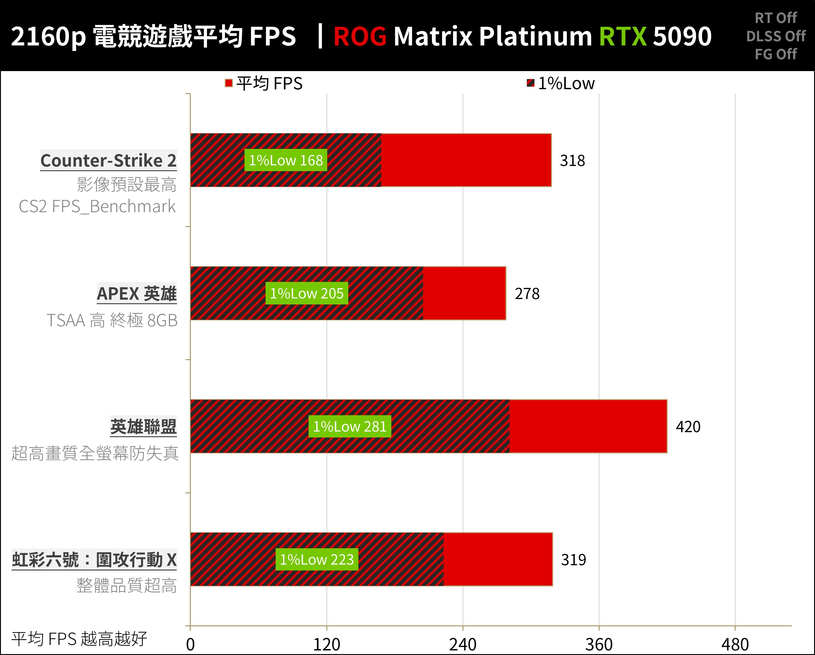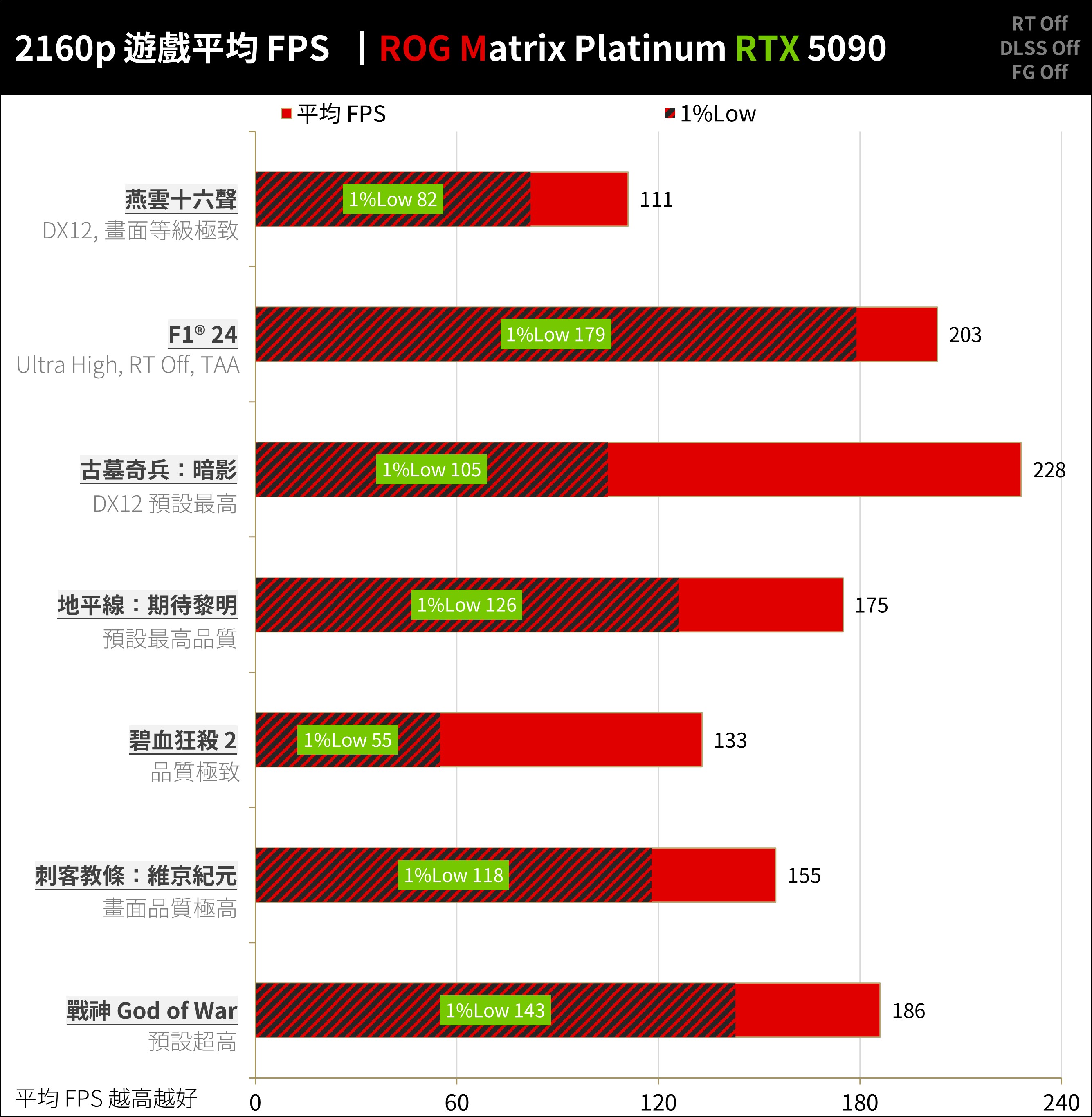 ROG Matrix Platinum RTX 5090 在 2160p、不追光不加速的 AAA 遊戲中達到平均 170.1 FPS / 1%Low 115.4 FPS 的效能;對於一般 AAA 遊戲玩家可在 4K 解析度下獲得原生解析度渲染的出色效能,即便 1%Low 也有 100+ FPS 以上的表現 。