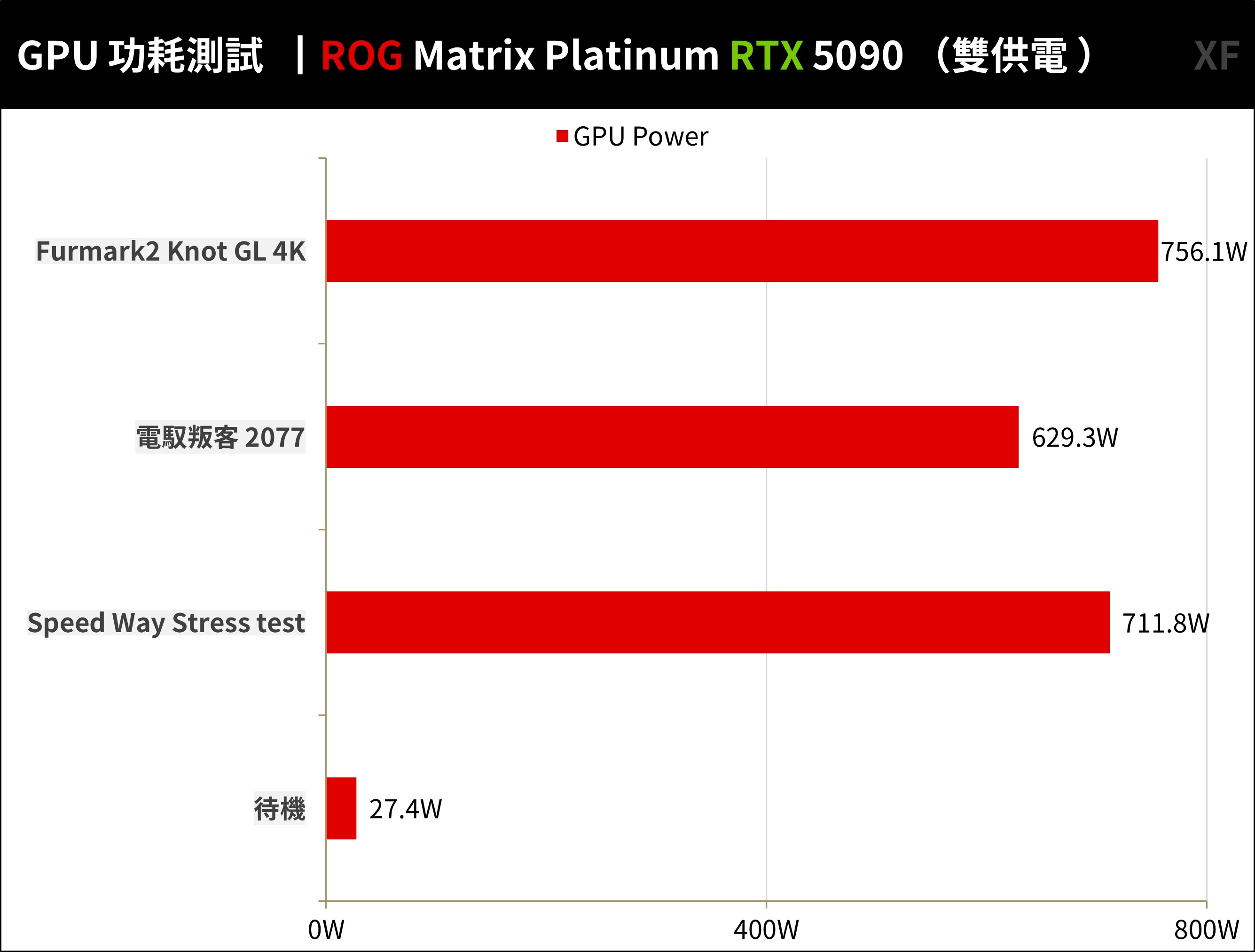 功耗方面,ROG Matrix Platinum RTX 5090 最高測到 756.1W 功耗、遊戲時約在 629.3W 左右。因此裝機時建議搭配至少 1200W 以上的電源供應器。