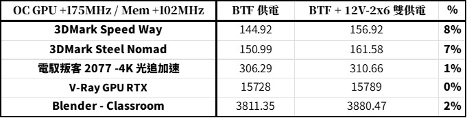 使用 BTF + 12V-2×6 雙供電相比 BTF 單供電,在 3DMark Speed Way 與 Steel Nomad 測試中可有著 7-8% 的差異;但是遊戲《電馭叛客 2077》測試僅 1% 提升,至於創作渲染相關工具則差異不大。