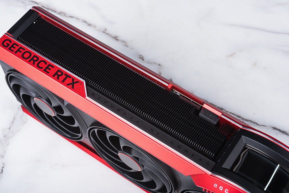 ↑ 顯卡側面滿滿的散熱鰭片,以及 GEFORCE RTX 字樣,而 REPUBILC OF GAMERS 則是具備 AURA 燈效。