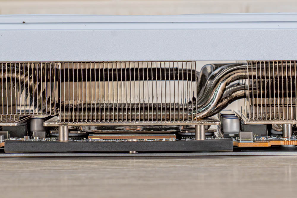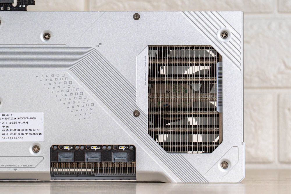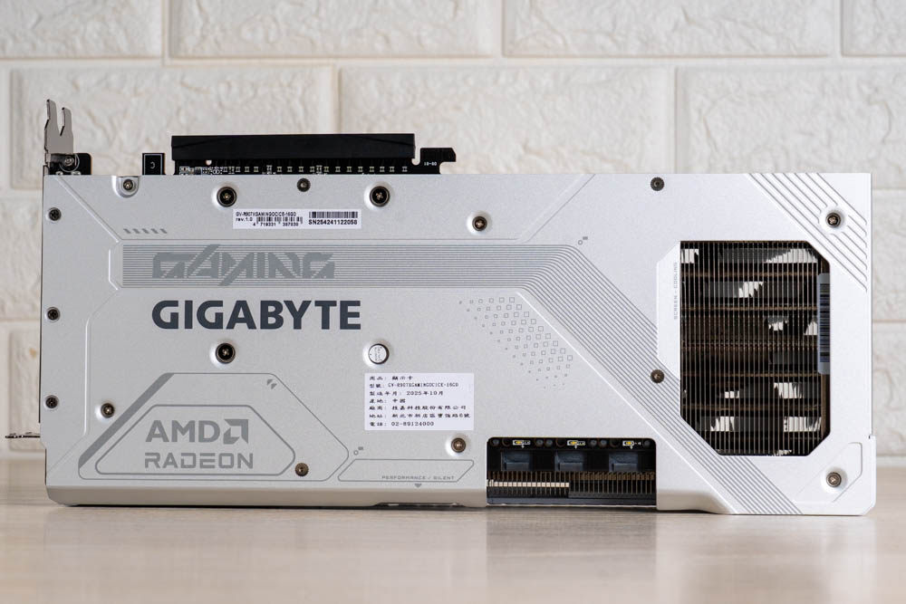此外,從顯卡內側面與背面開孔處,可見RX 9070 XT GAMING OC ICE 16GB 採用多根熱導管貫穿的散熱器模組,搭配大面積銅底,以及高延展性的導熱凝膠,可更好貼覆於顯卡記憶體 VRAM和MOSFET等重要電子元件,避免傳統導熱墊於長期使用後的變形問題,提供穩定長效的散熱效能。