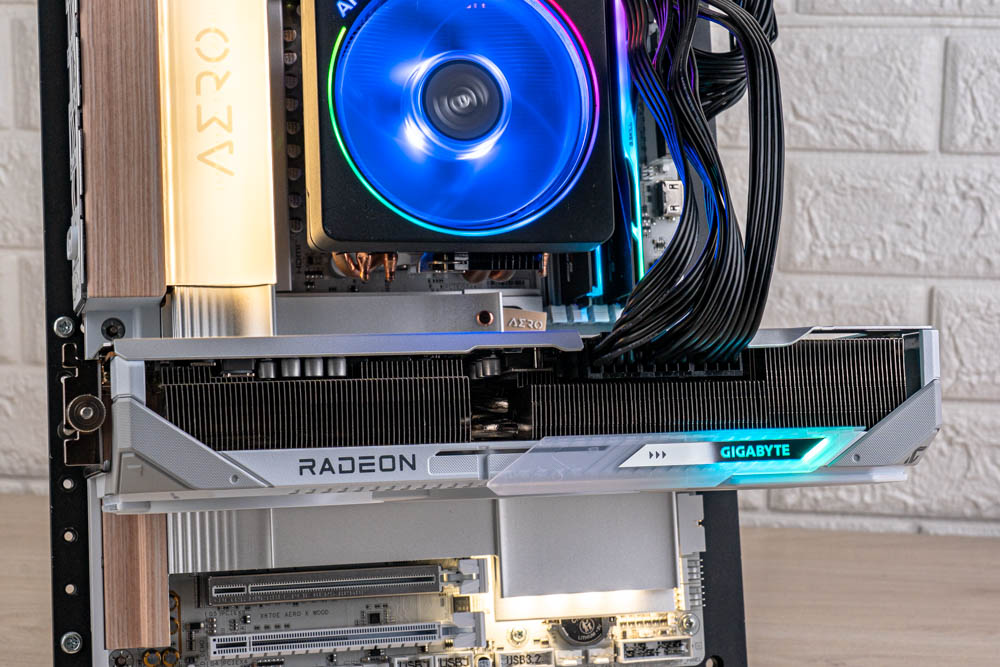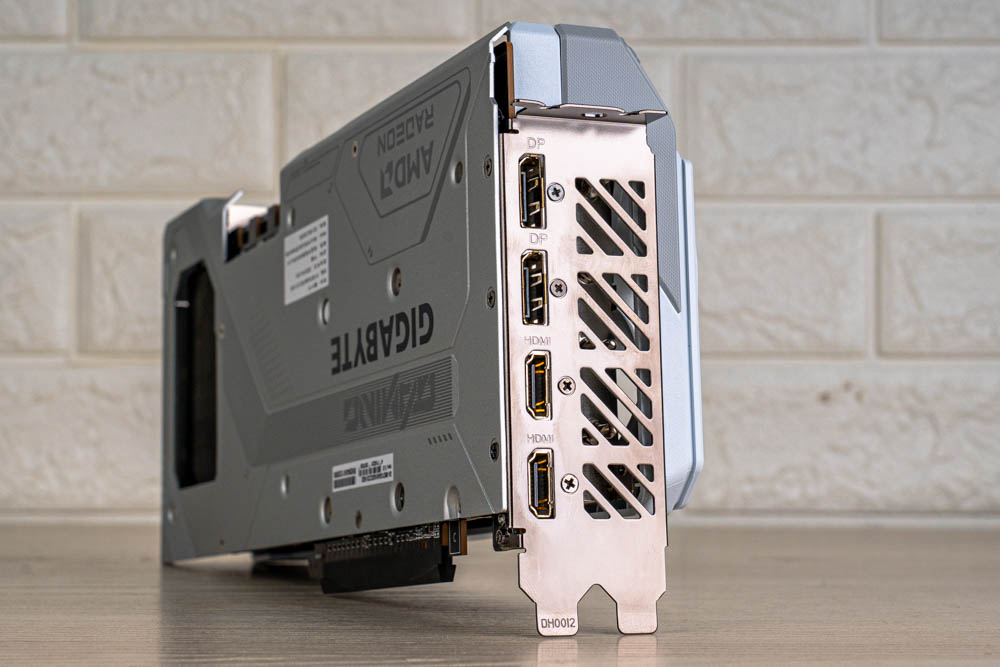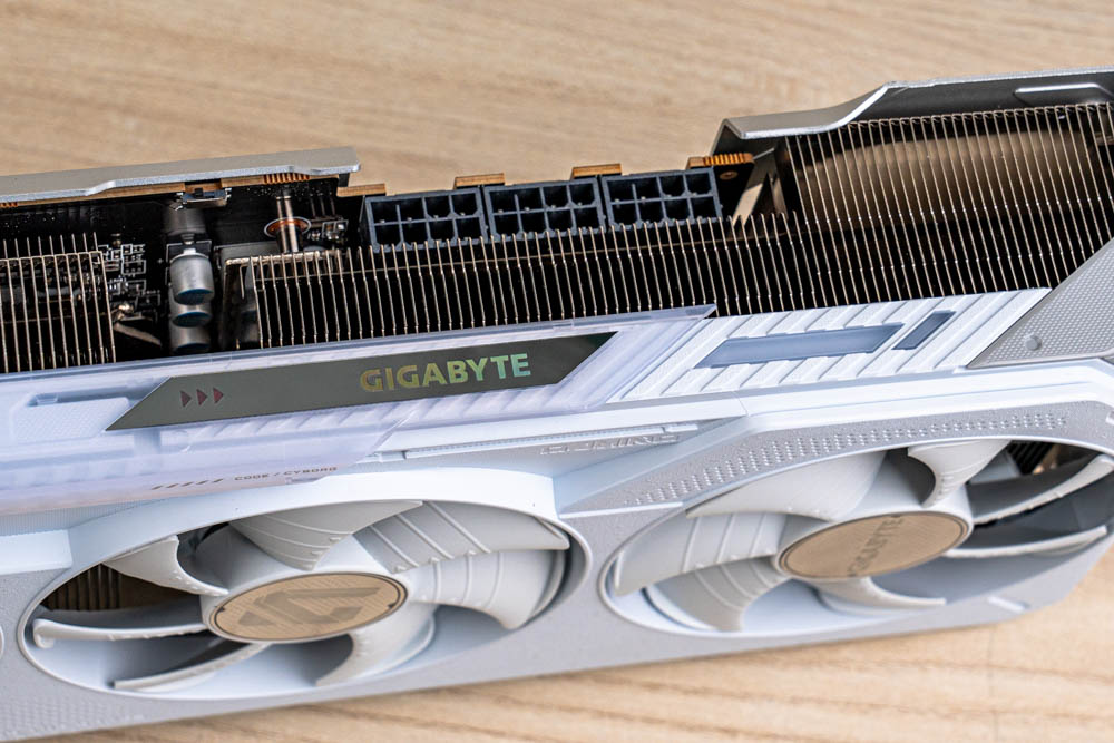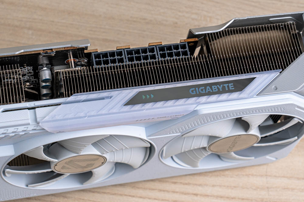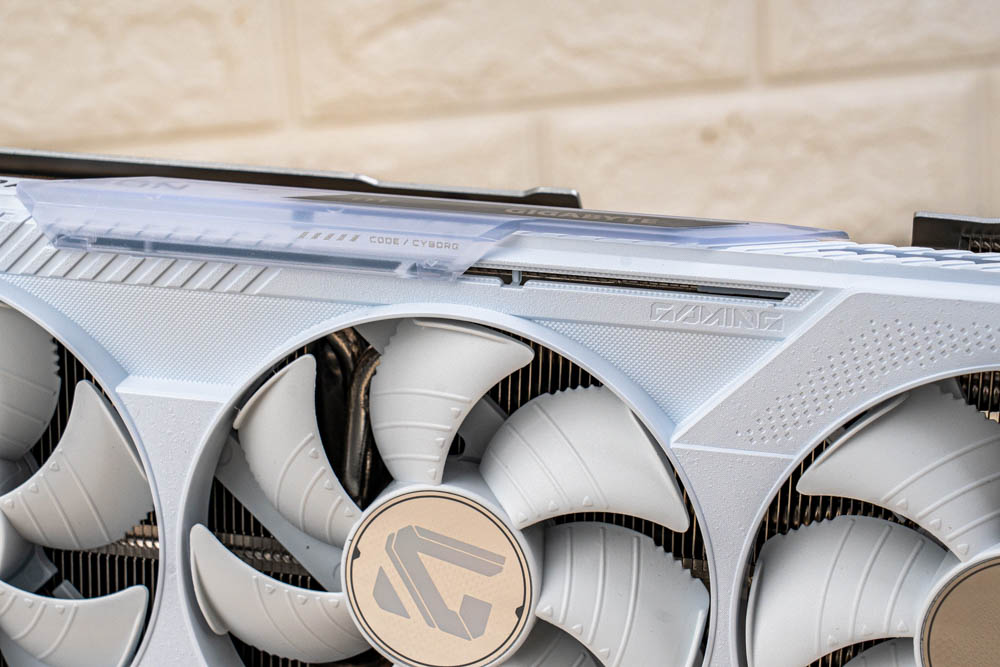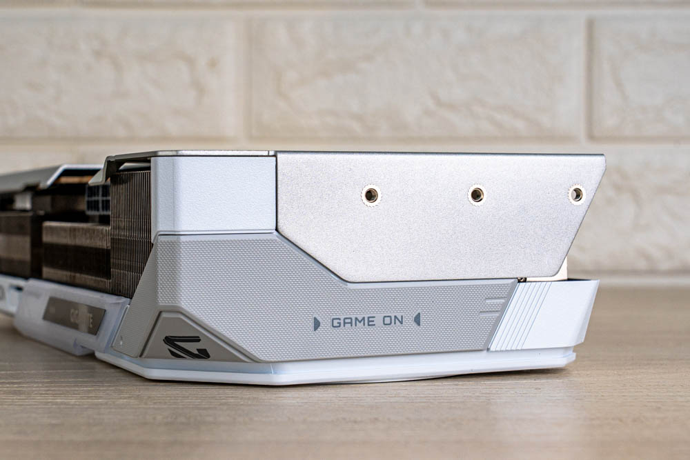 顯卡前方,延續正面的分件設計,透過標有灰色 > GAME ON < 的斜切導角,搭配延伸至前方的金屬磨砂背板,形成酷似 G 字型的多層次結構,半包覆著厚實熱導管散熱器;並且開有三個鎖孔,方便玩家使用 GIGABYTE 本家的多功能顯示卡支架。
