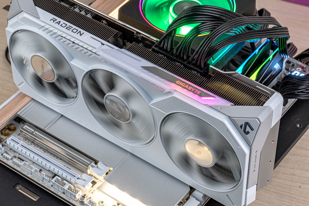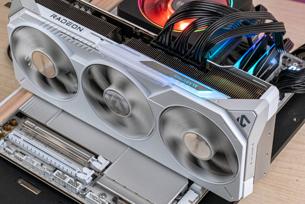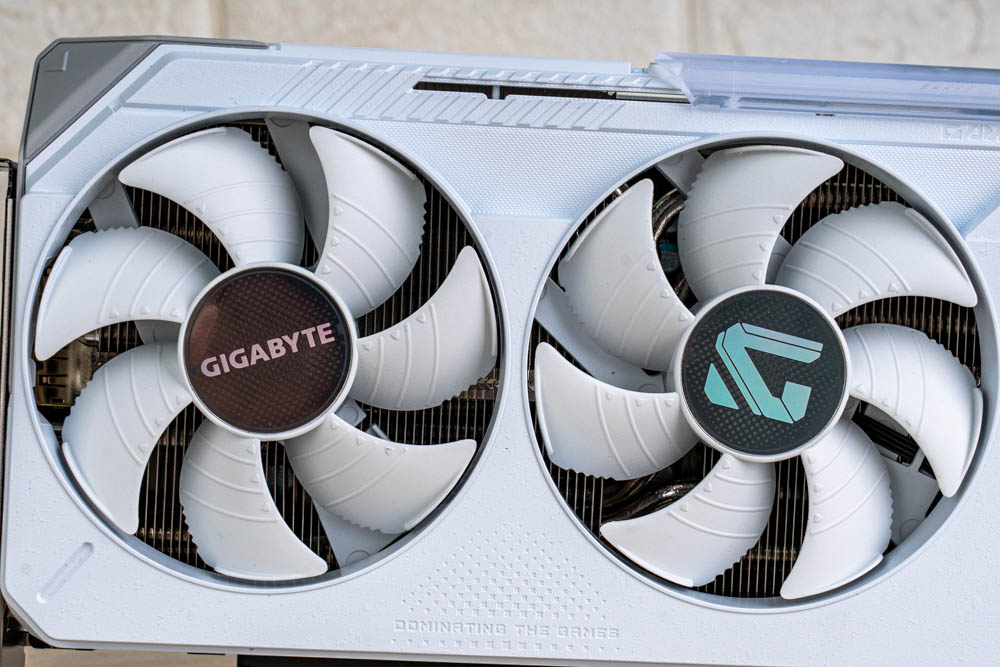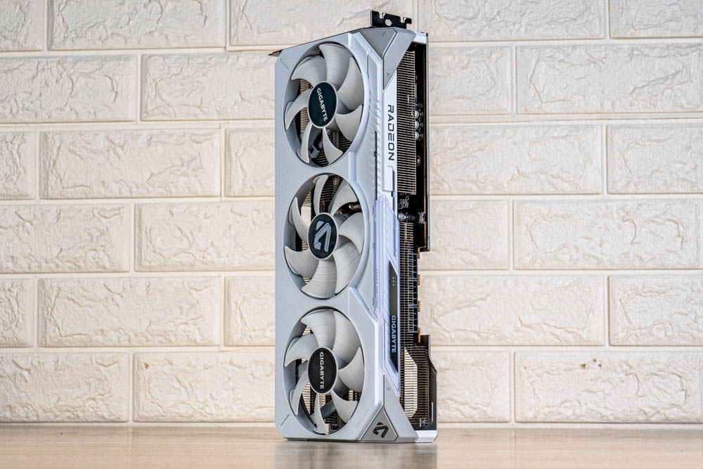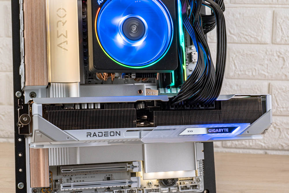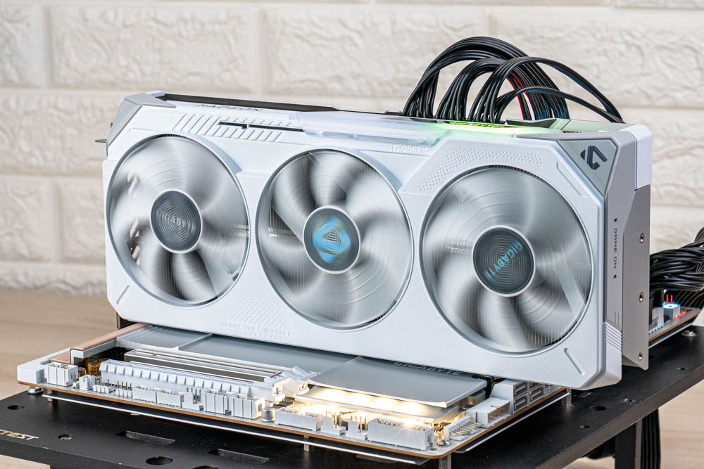 顯卡前方,延續正面的分件設計,透過標有灰色 > GAME ON < 的斜切導角,搭配延伸至前方的金屬磨砂背板,形成酷似 G 字型的多層次結構,半包覆著厚實熱導管散熱器;並且開有三個鎖孔,方便玩家使用 GIGABYTE 本家的多功能顯示卡支架。