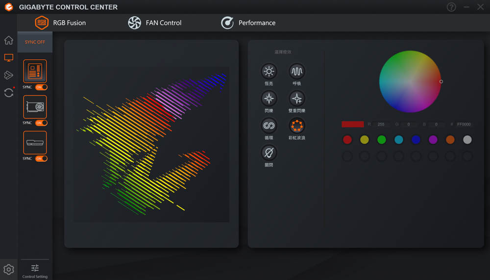 ↑ 可使用 GCC 軟體來調整顯卡 ARGB 燈效,預設為彩虹波浪模式。