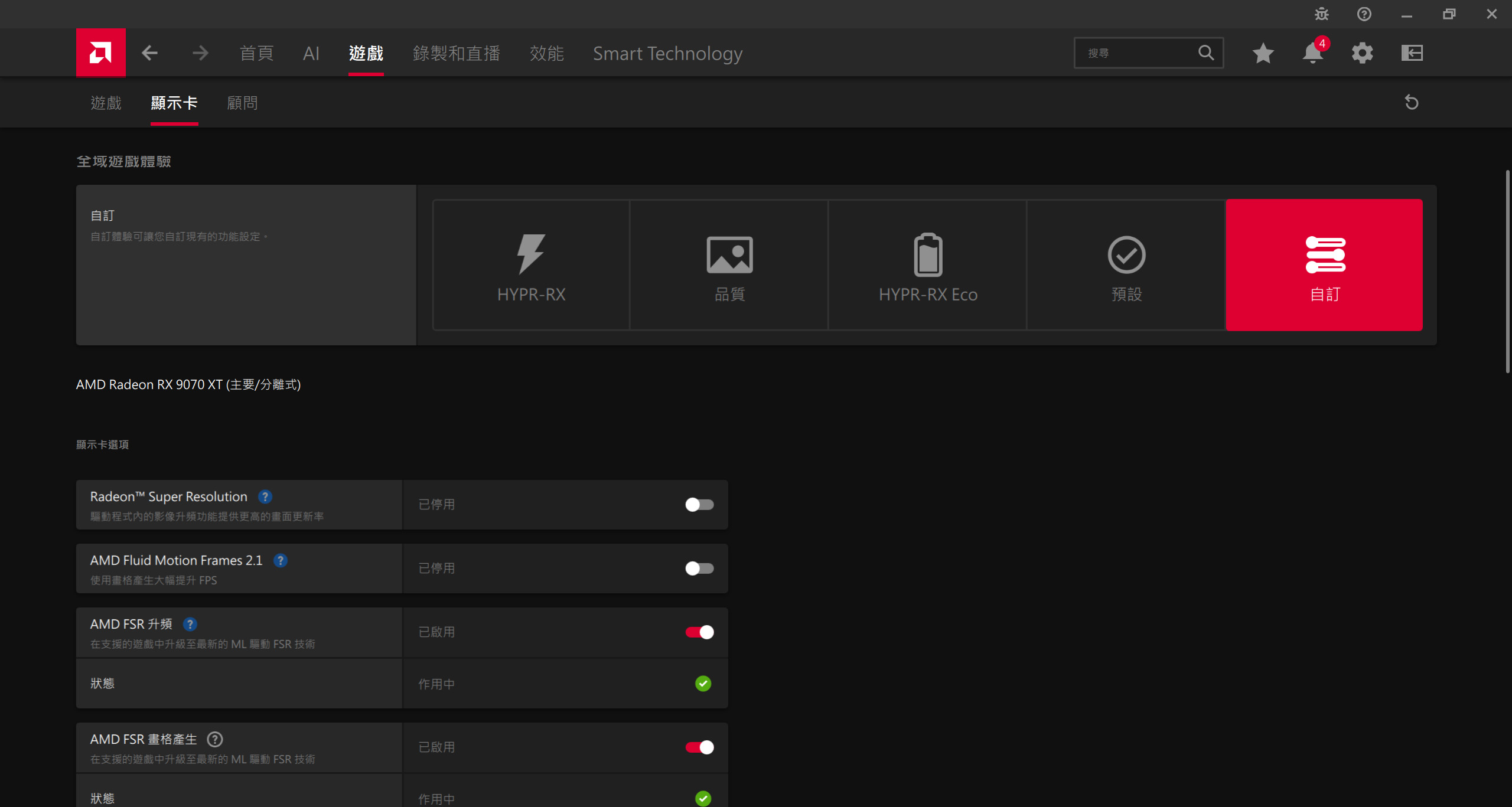 以下測試過程,全程使用AMD Radeon驅動軟體26.1.1版本,並於驅動程式中的全域遊戲體驗設定,自訂開啟 FSR 升頻、FSR 畫格產生等加速功能,進而讓支援 FSR 3.1以上的次世代遊戲,可經由驅動程式來啟用 FSR4。