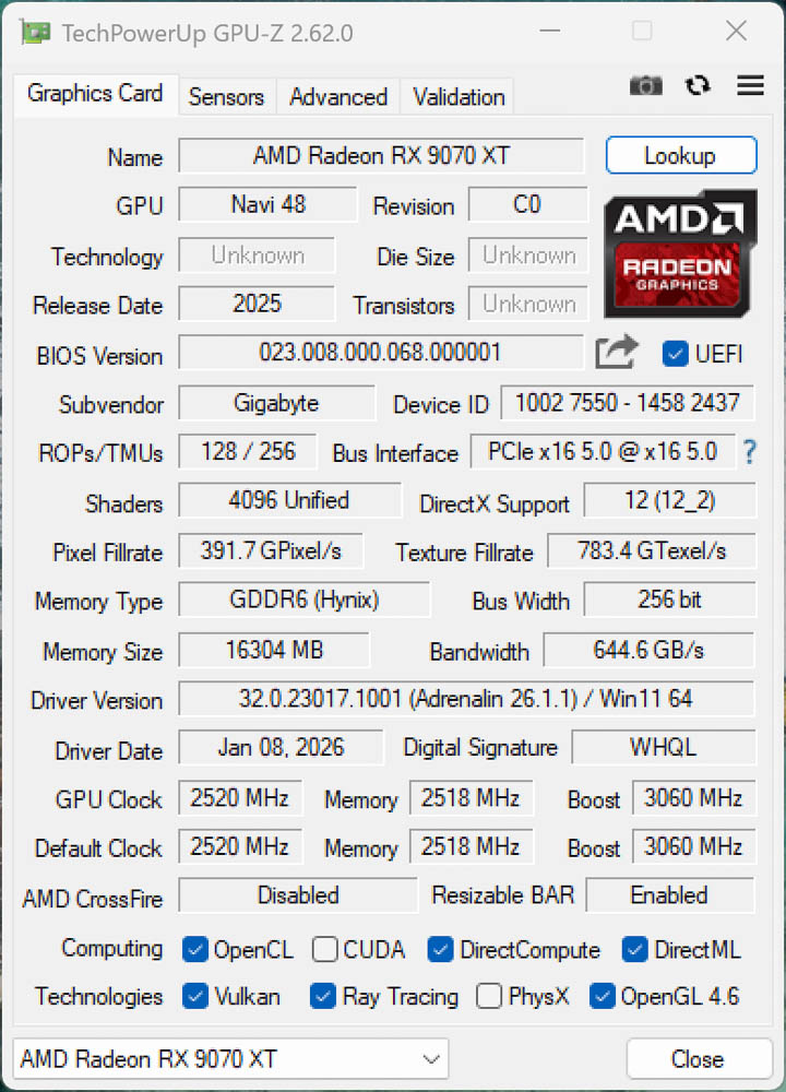首先使用 GPU-Z 來檢視驗證 RX 9070 XT GAMING OC ICE 16GB 資訊,採用 4nm 製程的 Navi 48 GPU,有著 4096 個渲染 Shader 核心,以及 16304 MB GDDR6(Hynix)記憶體,而 GPU 預設時脈 2520 MHz、Boost 3060 MHz。