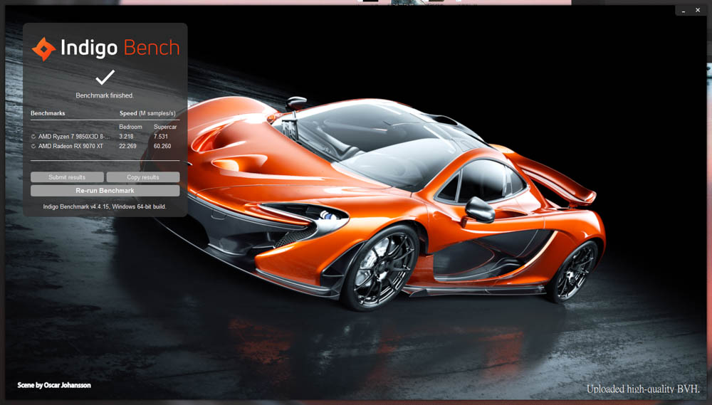Indigo Bench v4.4.15測試,GIGABYTE RX 9070 XT GAMING OC ICE 16GB 在 Badroom項目獲得 22.269 每秒鐘 M Sample 數量,而Supercar項目獲得 60.260 的成績結果。