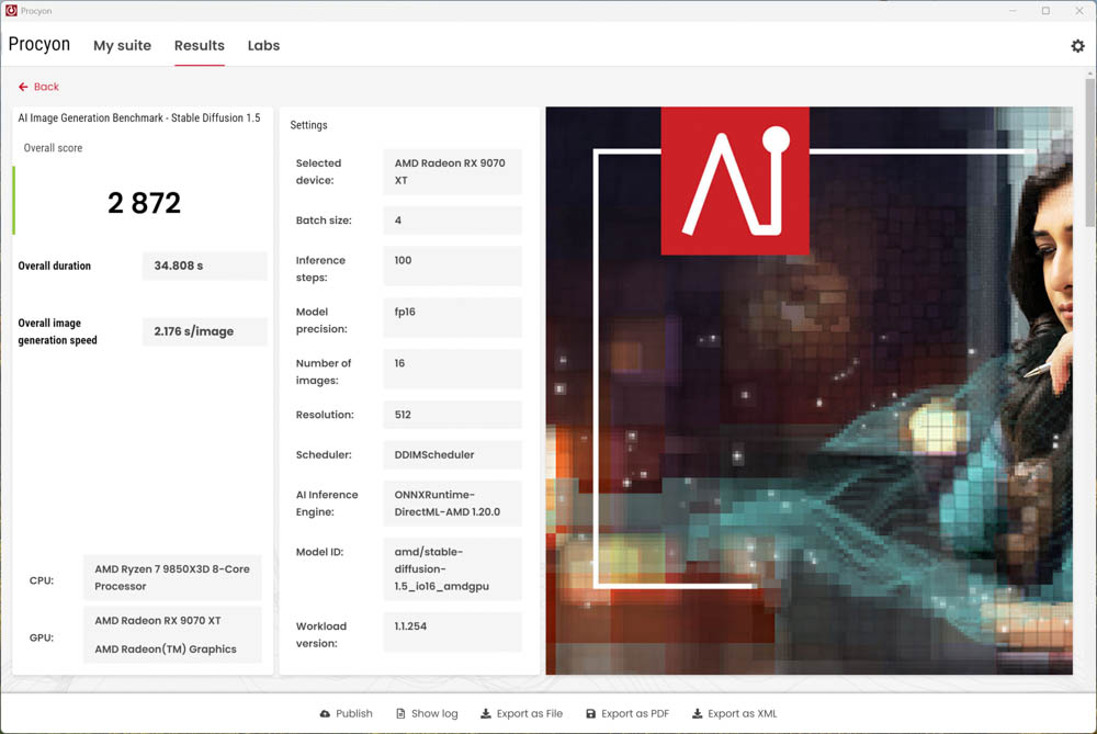 UL Procyon AI Image Generation Benchmark 提供 Stable Diffusion XL (FP16) 與 Stable Diffusion 1.5 (FP16) 的兩種測試情境,並支援 ONNX Runtime with DirectML- AMD、NVIDIA TensorRT 與 Intel OpenVINO 等推論引擎。