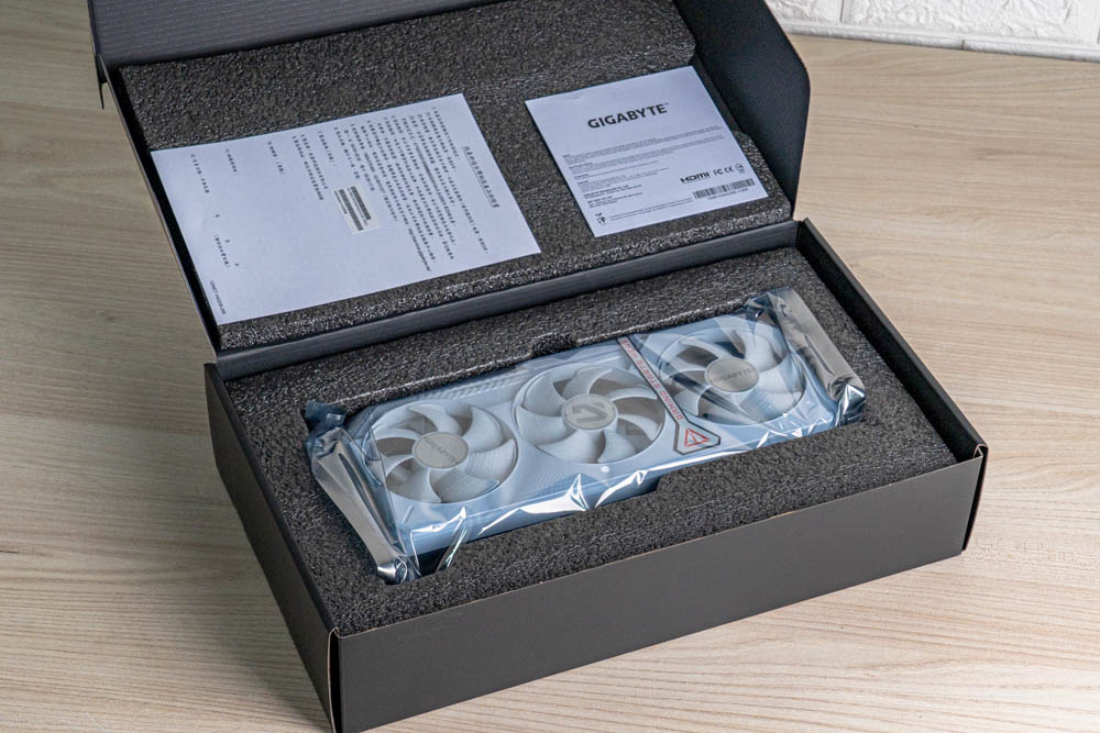 內盒擺設,採用常見的緩衝泡棉為顯卡提供防護,並隨附有使用手冊、經銷商保固卡一張。