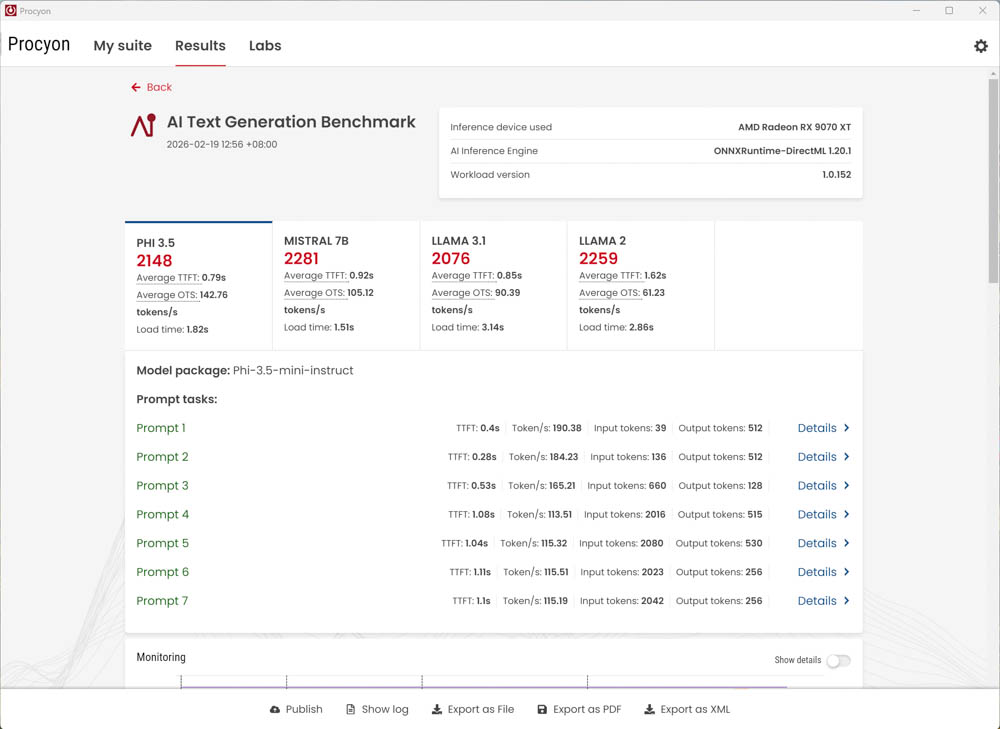 UL Procyon AI Text Generation Benchmark 提供 ONNX 模型包含 Phi-3.5-mini、Llama-3.1-8B、Mistral-7B 與 Llama-2-13B 測試,每個模型測試 7 個 Prompts 包含 RAG 與非 RAG 的查詢,通過權重後的總分與平均 Time To First Token(TTFT)、平均 Output Token Speed(OTS)提供專業用戶橫量電腦的 AI LLM 推論效能。