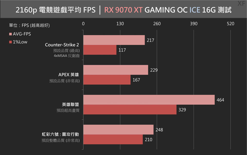 RX 9070 XT GAMING OC ICE 16GB主要在 4K 解析度下,取得 CS2 平均 217 FPS / 1%Low 117 FPS;APEX平均 229 FPS / 1%Low 167 FPS;英雄聯盟平均 464 FPS / 1%Low 329 FPS;虹彩R6平均 248 FPS / 1%Low 210 FPS,這效能表現,基本滿足 4K 電競玩家的高幀數遊戲需求。
