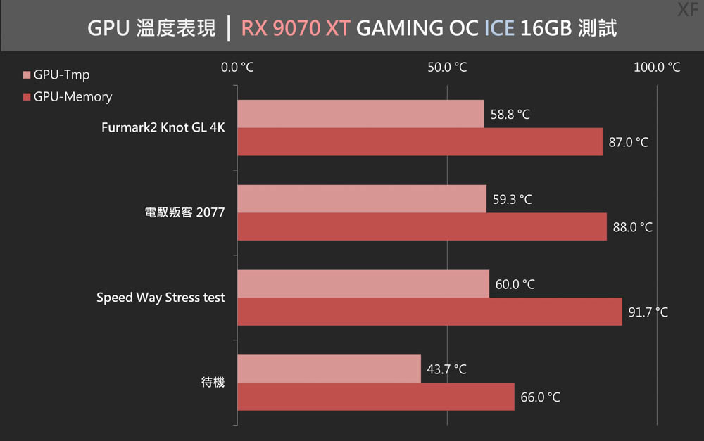溫度方面,RX 9070 XT GAMING OC ICE 16GB 在壓力測試下,最高溫度維持在 60°C、GDDR7 記憶體最高則為91.7°C溫度;代表即使處在機殼中,也可保有足夠的散熱表現,支援顯卡長效運作。