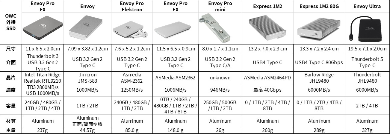 目前 OWC 外接 SSD 產品如下圖所示,主要的 Envoy 都是傳統 USB 的傳輸介面,直到 Express 1M2 的最早推出的 USB4 40Gbps 的外接 SSD 產品,以及隨後推出的 Envoy Ultra 採用 Thunderbolt 5 傳輸介面的外接 SSD,而新推出的 Express 1M2 80G 則是採用相同控制晶片,但有提供 0TB 外接盒的款式。